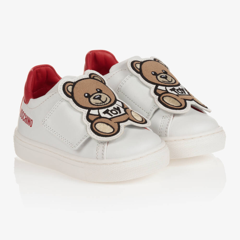White leather trainers for boys and girls by Moschino Kid-Teen, detailed with a Moschino Teddy Bear velcro strap. They have contrasting panels of red and red printed logos. They are fully lined in leather, with a leather inner sole and feature a white non-slip rubber outer sole.