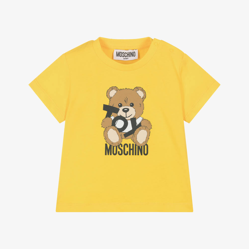 Bright yellow cotton T-shirt for little boys and girls unmistakably by Moschino, with the brand's iconic Teddy Bear and logo printed on the front. It is made in soft, comfortable jersey, with poppers on one shoulder for fuss-free dressing.