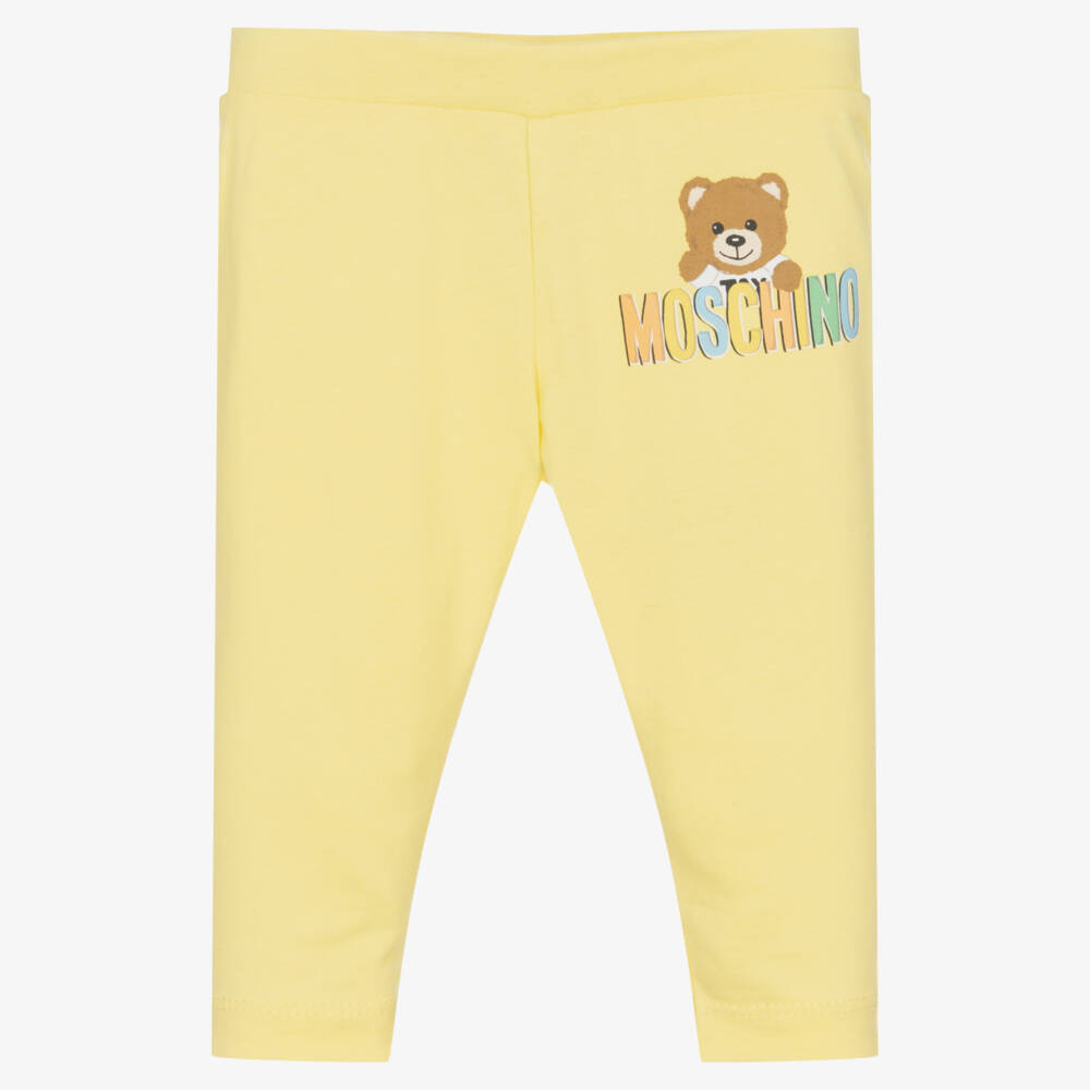 Bright yellow leggings for little boys and girls by Italian brand Moschino Baby, made in soft, comfortable cotton jersey. Designed to stand-out, they have the brand's iconic Teddy Bear logo printed on the front. There is a stretchy elasticated waistband for an easy, pull-on style.