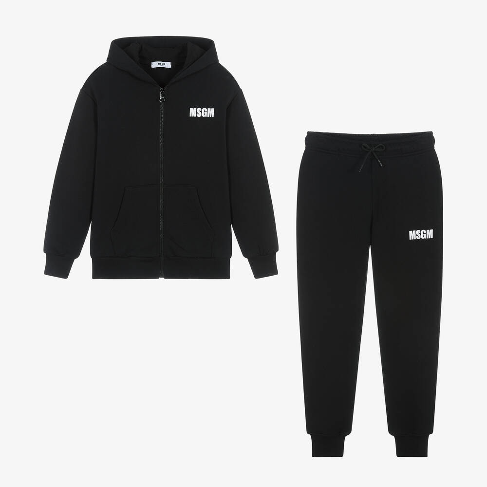 Casual and stylish, this black tracksuit for boys and girls by MSGM is made in comfortable cotton jersey with a soft, brushed feel inside. Both pieces have white logo prints on the front for a signature look by the Italian brand. The zip-fastening, hooded top has a sporty pouch pocket and a large white logo on the back, with the words, 'Never look back it's all ahead'. The cuffed joggers have a drawstring waist, concealed side pockets and a patch pocket on the back.