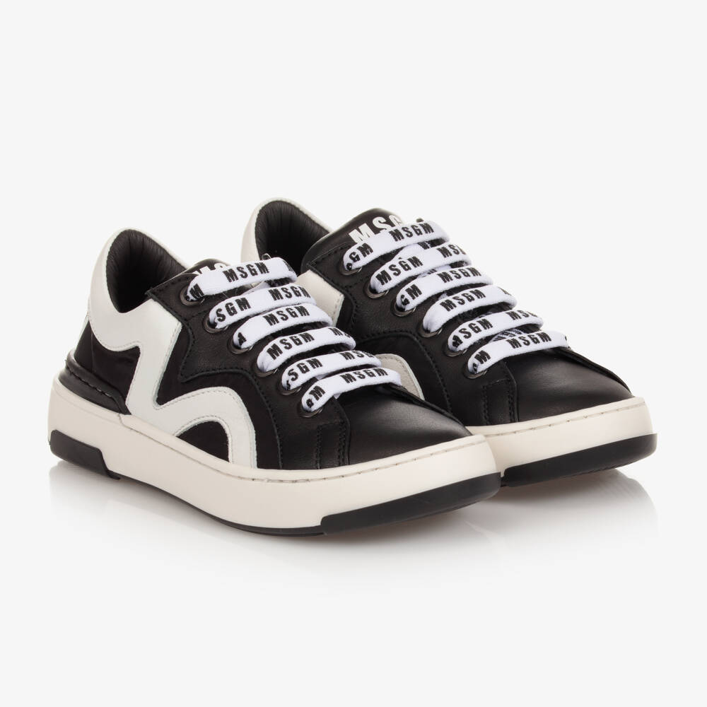 Black leather trainers for boys and girls by MSGM, with white trim and logo print. Made and lined in soft supple leather, they fasten with branded laces and have white and black non-slip soles.