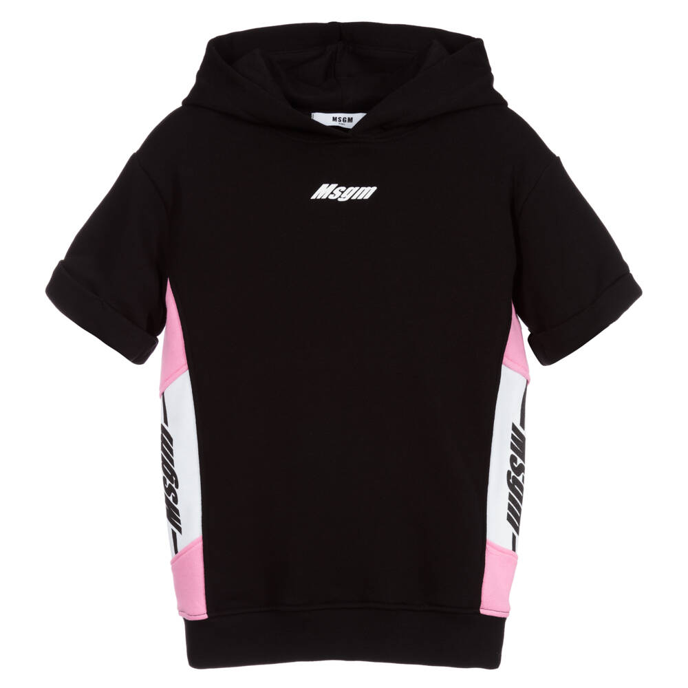Girls black cotton dress by MSGM, with pink and white logo trims. Made from soft lightweight looped back jersey. This sporty style dress has a small white logo printed on the front and a large jersey lined hood.