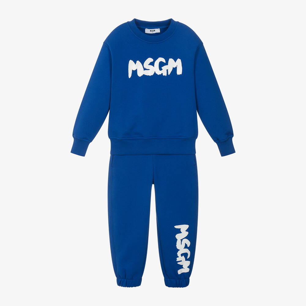 Bright blue tracksuit for boys and girls by Italian brand MSGM, made in soft, mid-weight cotton jersey with a warm, fleecy inside. Casual and comfortable, the sweatshirt top has a crew neckline and stretchy ribbed trims. The matching joggers have side seam pockets and a drawstring waistband to ensure a great fit. For a distinctive designer look, both pieces are detailed with a bold, white brushstroke logo.