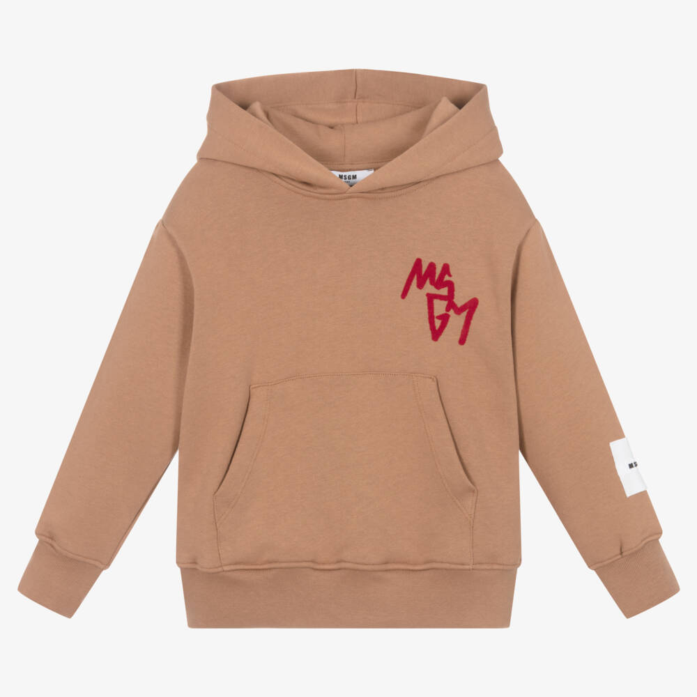 Dark beige hooded sweatshirt for boys by MSGM, made in comfortable cotton jersey with a cosy fleece feel inside. For a stylish designer touch, it has an angular flocked red logo on the chest and an embroidered logo patch on one sleeve. It is finished with a front pouch pocket and ribbed trims to complete the casual look.