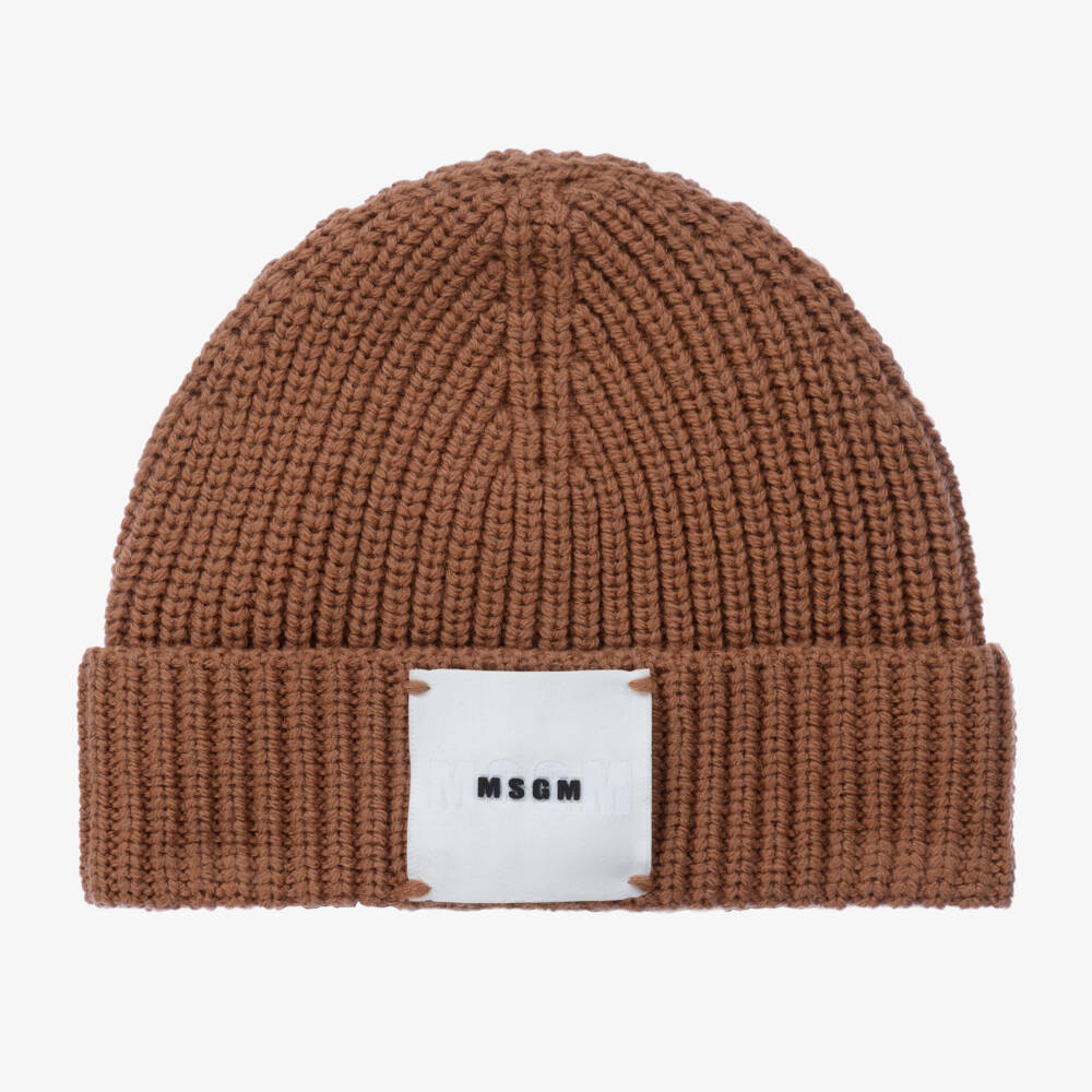 Tan brown beanie hat for boys by Italian brand MSGM, knitted in a super soft virgin wool blend. It can be paired with any outfit for an instantly cool upgrade. The turned-up brim has an ivory logo badge stitched on the front for a branded sign-off.