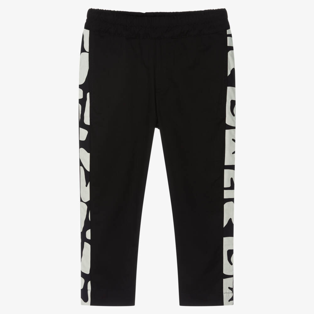 Trimmed with ivory logo lettering down the sides for a signature look, these black trousers for boys are by Italian brand MSGM. Made in smooth cotton, they have an elasticated waist with internal drawstring ties for an adjustable fit. There are pockets on the front seams, with an additional pocket on the back for carrying everyday essentials.