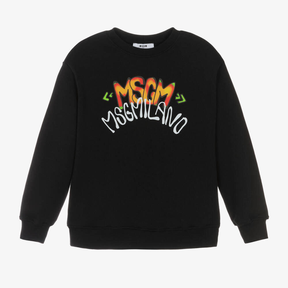A black long-sleeved sweatshirt for boys from MSGM, instantly recognisable with an orange and green logo printed on the front and a white MSGMILANO logo below. With a relaxed fit, the soft, mid-weight cotton fabric and laid-back, dropped shoulders complete this casual, comfortable design.