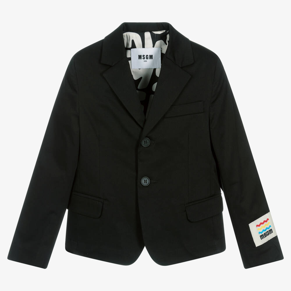 Boys black tailored blazer by MSGM. Styled in cotton poplin with an abstract logo printed lining, it fastens with two-button and has an ivory logo patch on one sleeve for a designer finish.