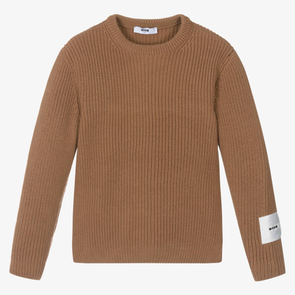 Brown wool-blend jumper for boys from Italian brand MSGM. This cosy ribbed crew-neck design is patterned with a red logo on the back and has an embroidered logo patch on one sleeve for instant designer appeal.