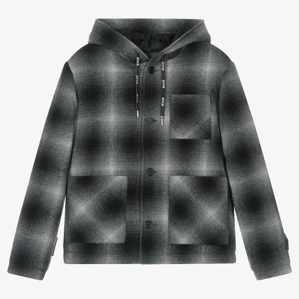 Cool and casual grey and white check jacket for boys by MSGM, made in a soft brushed flannel. Lightly padded with a soft and silky quilted lining for warmth, it fastens on the front with logo-embossed buttons. In a stylish, relaxed fit, it has three patch pockets on the front, a white patch with rubberised logo on the hood, and branded drawstring pulls for a discreet designer look.