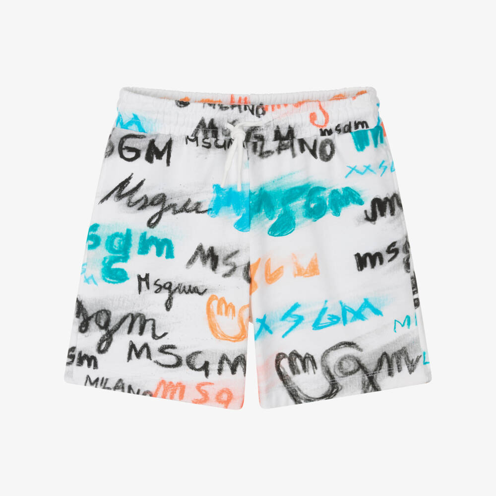 White cotton shorts for boys by MSGM, patterned with a combination of colourful MSGM signatures. Both casual and comfortable, they are made in soft, mid-weight jersey, with side seam pockets and a drawstring waistband.