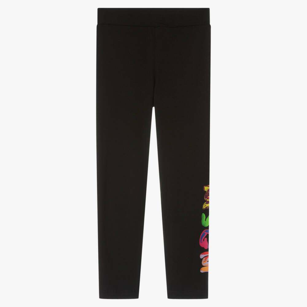 Black cotton leggings for girls by MSGM, with a colourful paint logo printed down one leg. Made from soft, stretchy jersey, they have an elasticated waistband for comfortable wear and easy dressing.