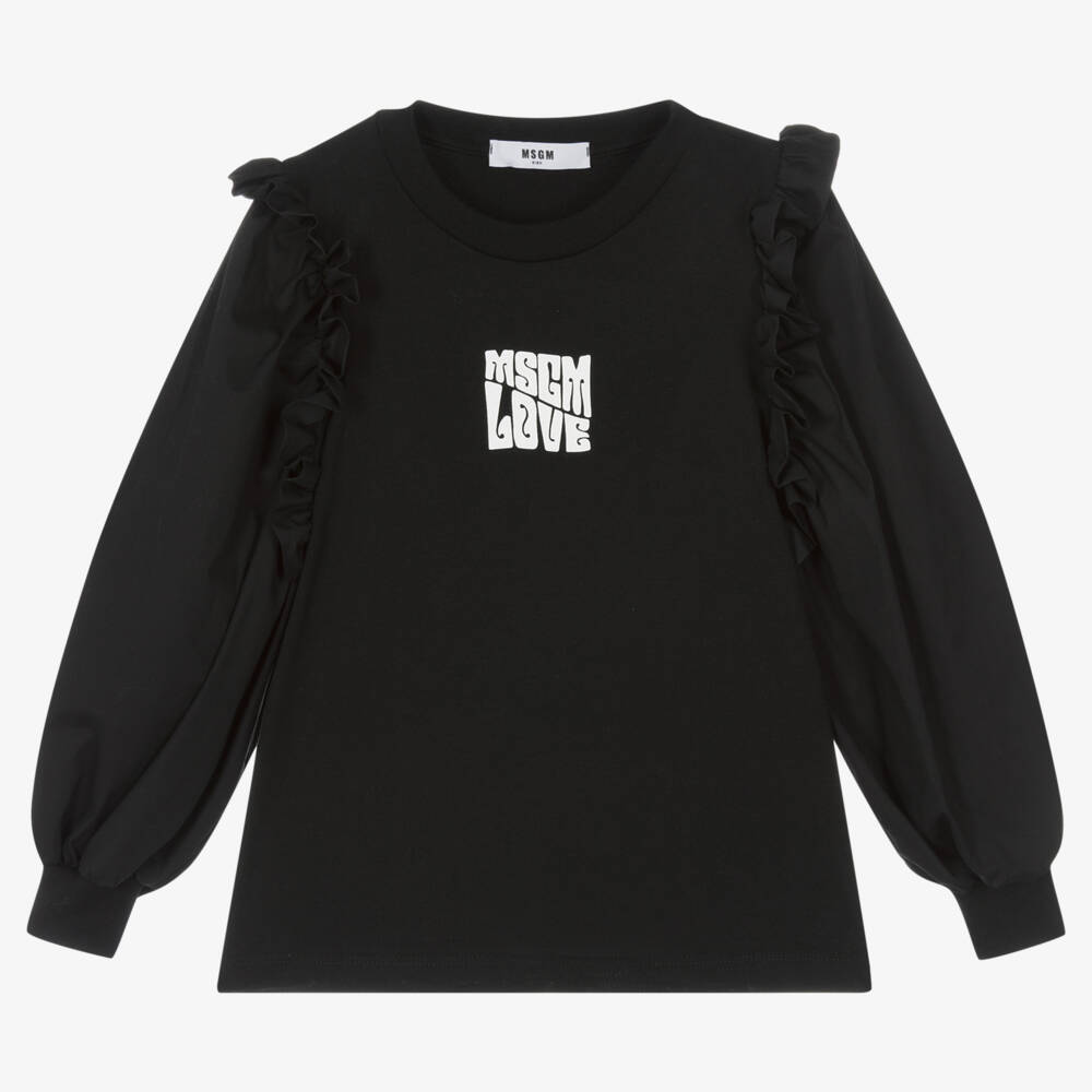 Black cotton top for girls by Italian brand MSGM, with 'MSGM Love' printed in white on the front. Made in super soft and stretchy cotton jersey, it has statement poplin sleeves with ribbed cuffs for a lovely puffed look and pretty ruffles across the shoulder to finish the look.