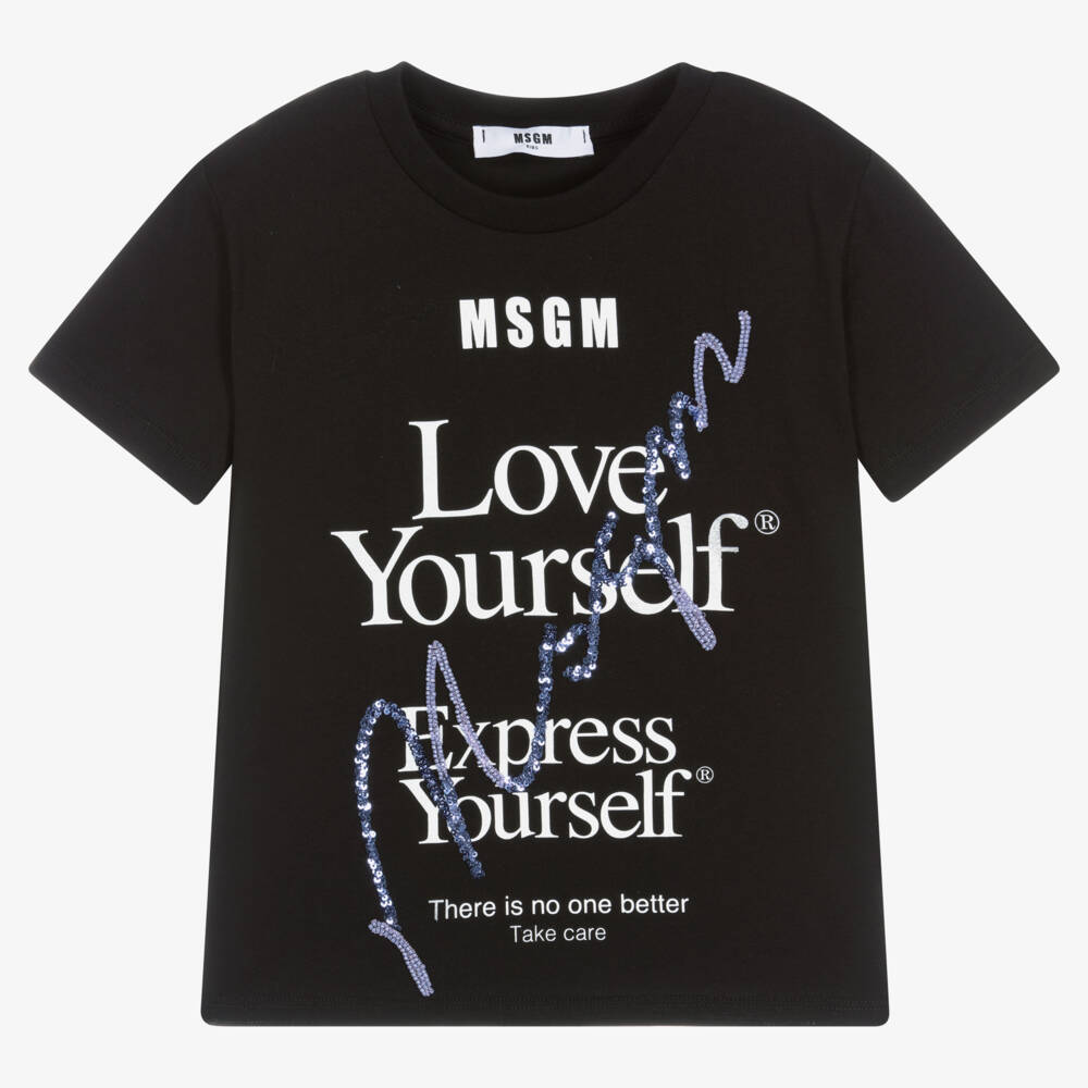 Black cotton T-shirt for girls by Italian brand MSGM. This soft and stretchy jersey top is printed with an MSGM Love Yourself® logo graphic in white, with a lilac sequinned and beaded script logo above for a textured finish.