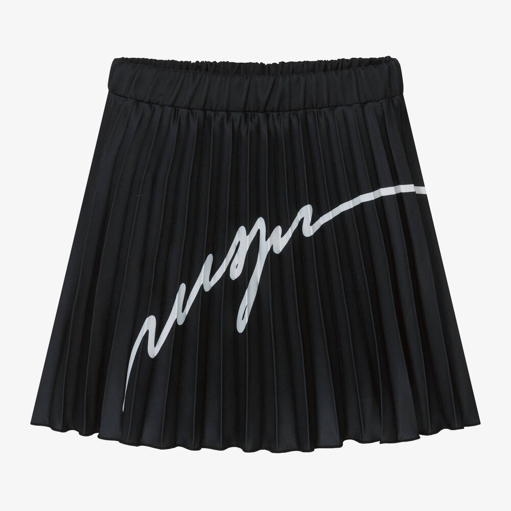 Black pleated crêpe skirt for girls by Italian brand MSGM, with a large cursive logo across the front in white for instant designer appeal. With a comfortable, elasticated waistband, it simply pulls up, and there is a super soft viscose lining.