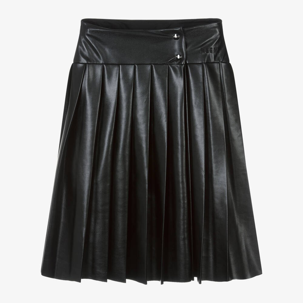 A stylish black skirt for girls by Italian brand MSGM, made in smooth faux leather. In a modern wrap-around design, this pleated skirt fastens on the front with two branded poppers and inside with a button. It is lined in soft cotton for comfort and has an adjustable waistband to ensure a good fit. Adding a discreet designer finish, the brand's logo is embroidered in black on the front.