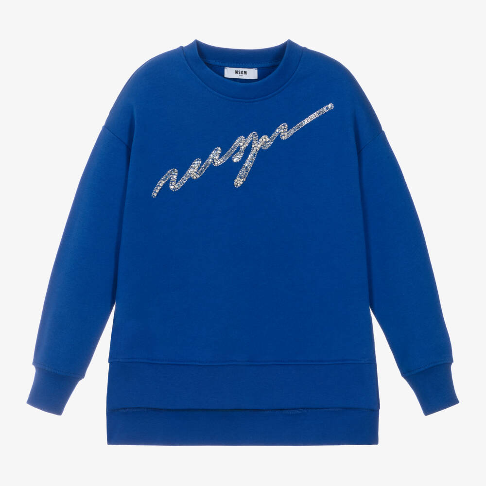 Royal blue cotton sweatshirt dress for girls by Italian brand MSGM, with an eye-catching cursive logo on the front, sparkling with diamantés, sequins and beads. Made in comfortable jersey, it is simply styled with a crew neckline, long sleeves and ribbed trims. The hem is slightly longer on the back adding a casual touch to this classic style. Completing the look, a white micro logo print can be seen on the back.