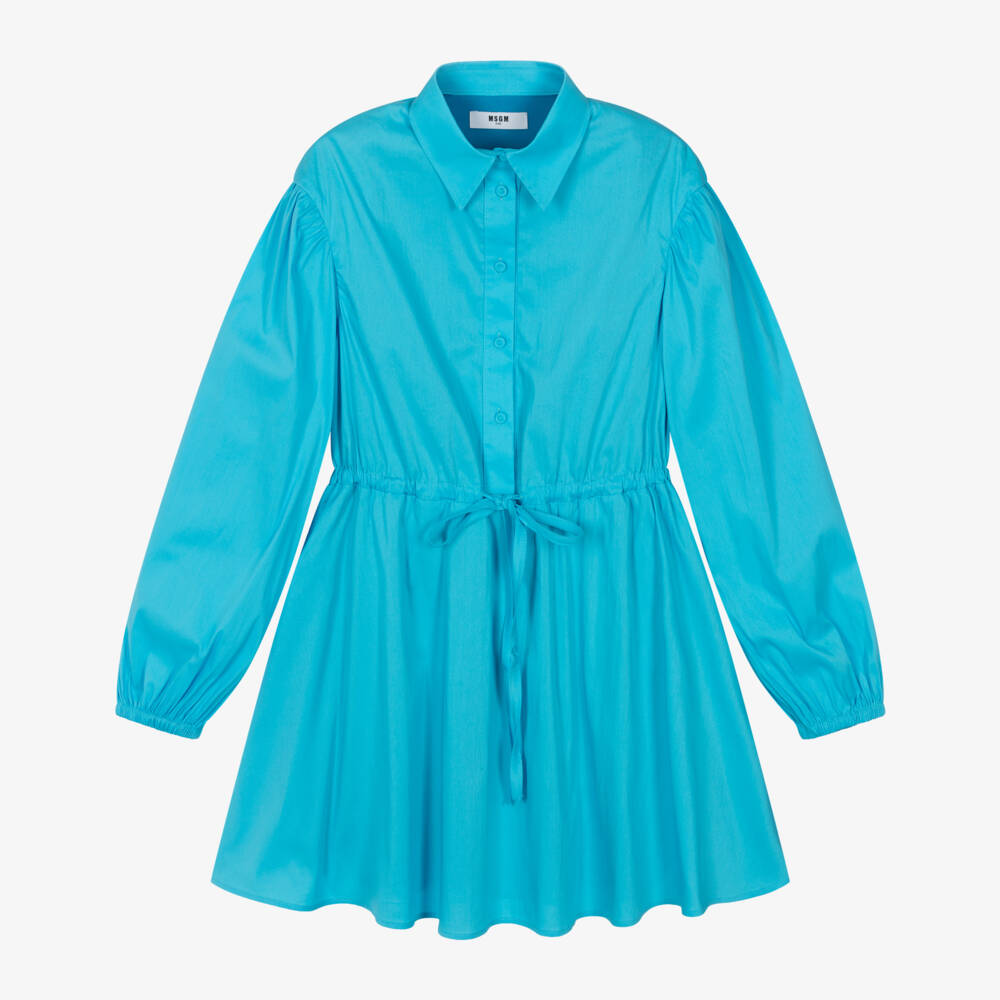 Bright blue cotton dress for girls by MSGM, in the style of a shirt. Made in soft poplin, it has button fastenings on the front, with a drawstring waist and gently elasticated cuffs on the gathered sleeves. Lined in lightweight voile, the brand's cursive logo is embroidered on a grosgrain tab around the back.