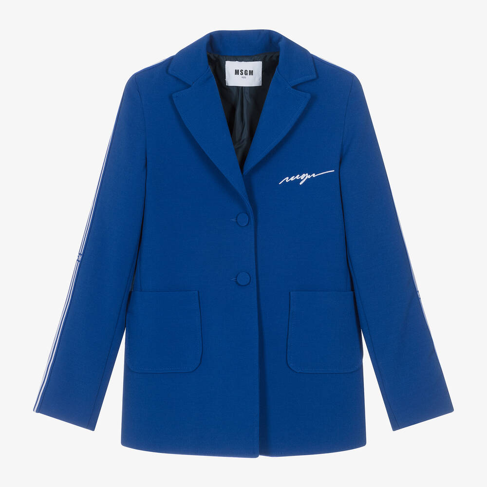 Designed by MSGM, this royal blue blazer for older girls is embroidered with a white cursive logo on the chest. It is made from a smooth viscose-blend with a silky lining and has jacquard knit tape trims with white stripes and repeat logos along the sleeves for a sporty style. Fastening with covered buttons on the front, it has patch pockets and a smart revere collar.