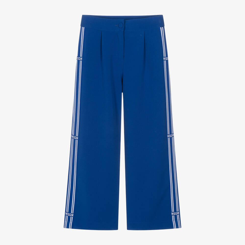 Cobalt blue wide-leg trousers for older girls by MSGM, made from a smooth viscose-blended weave. For a sporty style, they are stitched with white striped tape trims on the side featuring the brand name for a signature finish. They fasten with a zip and button on the front and the waistband is adjustable for a comfortable fit.