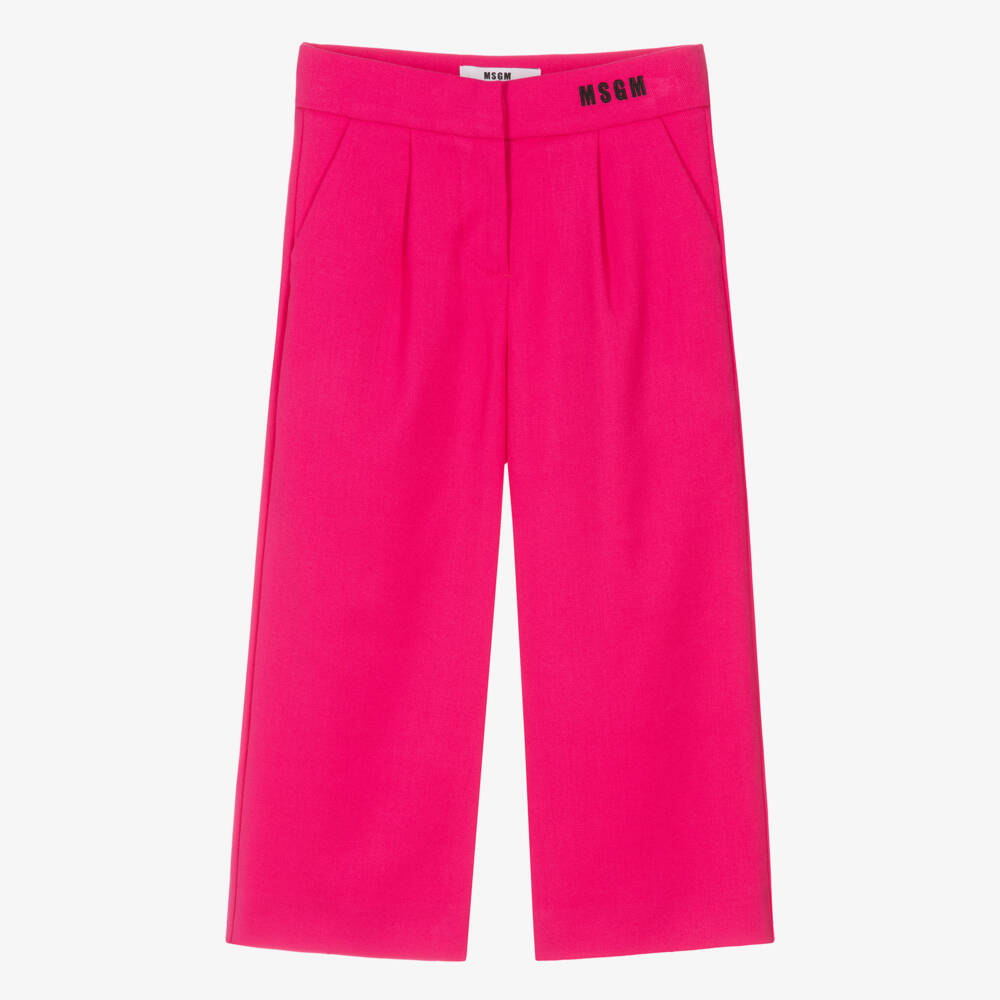 Tailored fuchsia pink trousers for girls by Italian brand MSGM, with black logo embroidery on the waist. Endlessly smart, they are made in soft twill, with little pleats on the front, slanted pockets and stylish wide legs. Comfortable too, they have an adjustable waist for a good fit, fastening with a concealed hook and eye and zip.