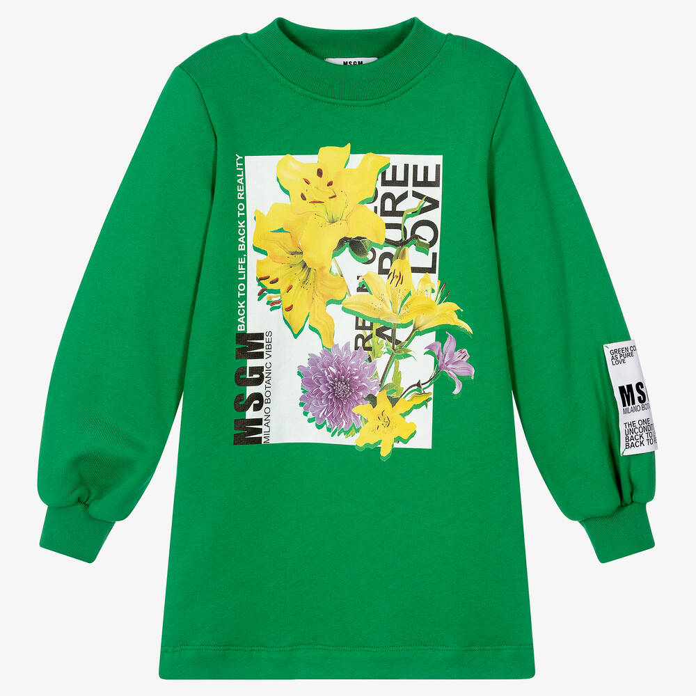 Bold green cotton sweatshirt dress for girls by MSGM, made in soft mid-weight cotton jersey, with a fleecy inside. Great for adding a colourful touch to any wardrobe, this casual dress has a yellow, lilac purple and green floral print on the front with a black MSGM logo print. There is a chic turtleneck-style ribbed neckline and a white branded patch on the cuff.