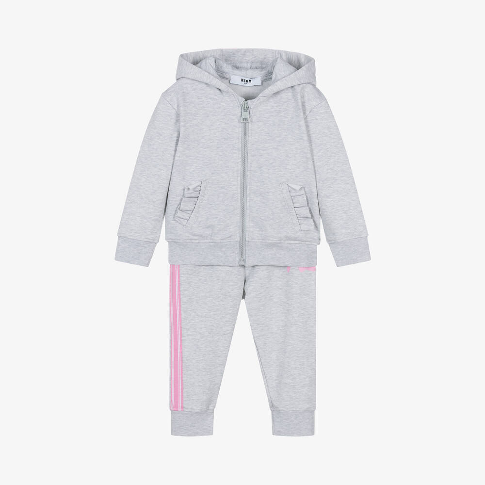 Grey marl tracksuit for little girls by Italian brand MSGM, made in soft, mid-weight cotton jersey with a warm, fleecy inside. The zip-up, hooded top has faux pockets on the front with sweet ruffle trims. The joggers have a patch pocket on the back and an elasticated waistband for comfortable wear. Both pieces have sporty pink tape trims and pink brushstroke logos for a pretty designer finish.