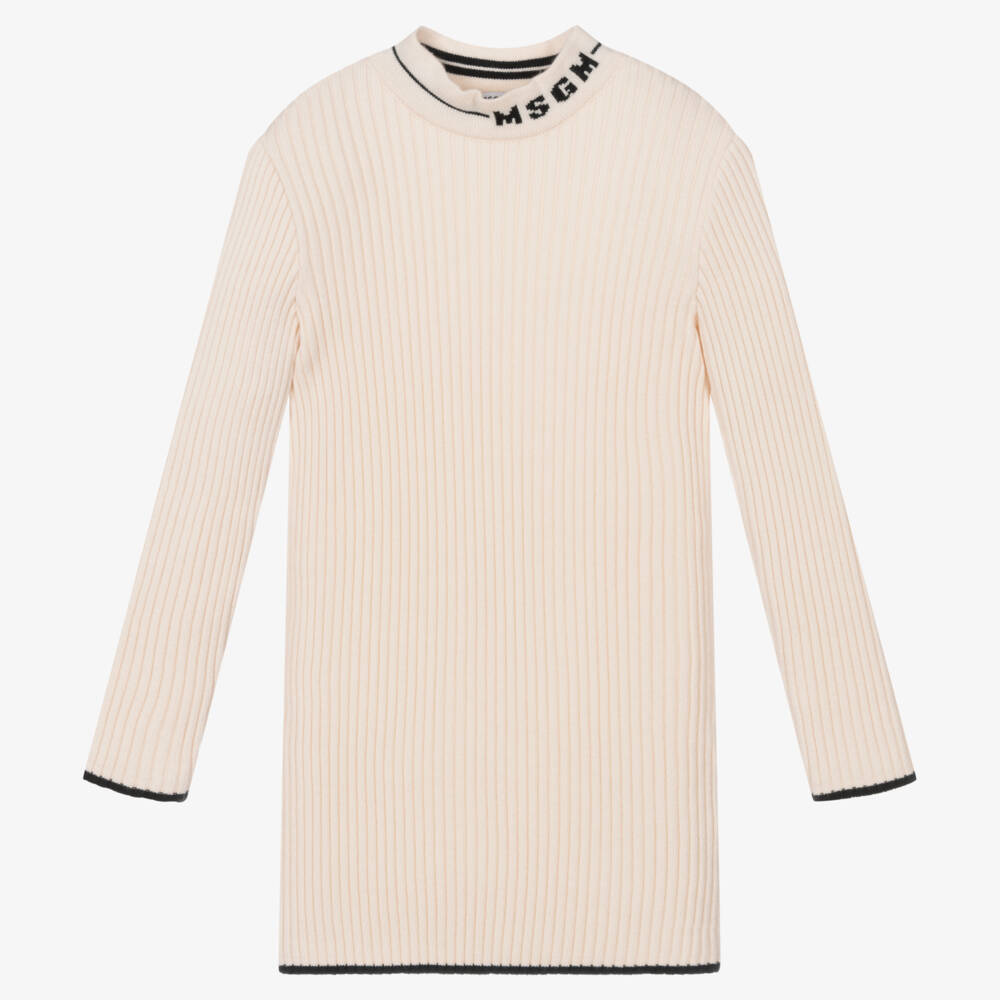 Ivory ribbed dress for girls by Italian designer MSGM. Made in a super soft viscose-blend knit, it has a turtle-style neckline with a black jacquard MSGM logo and black trims. Warm, comfortable and easy to wear, it simply pulls on over the head.