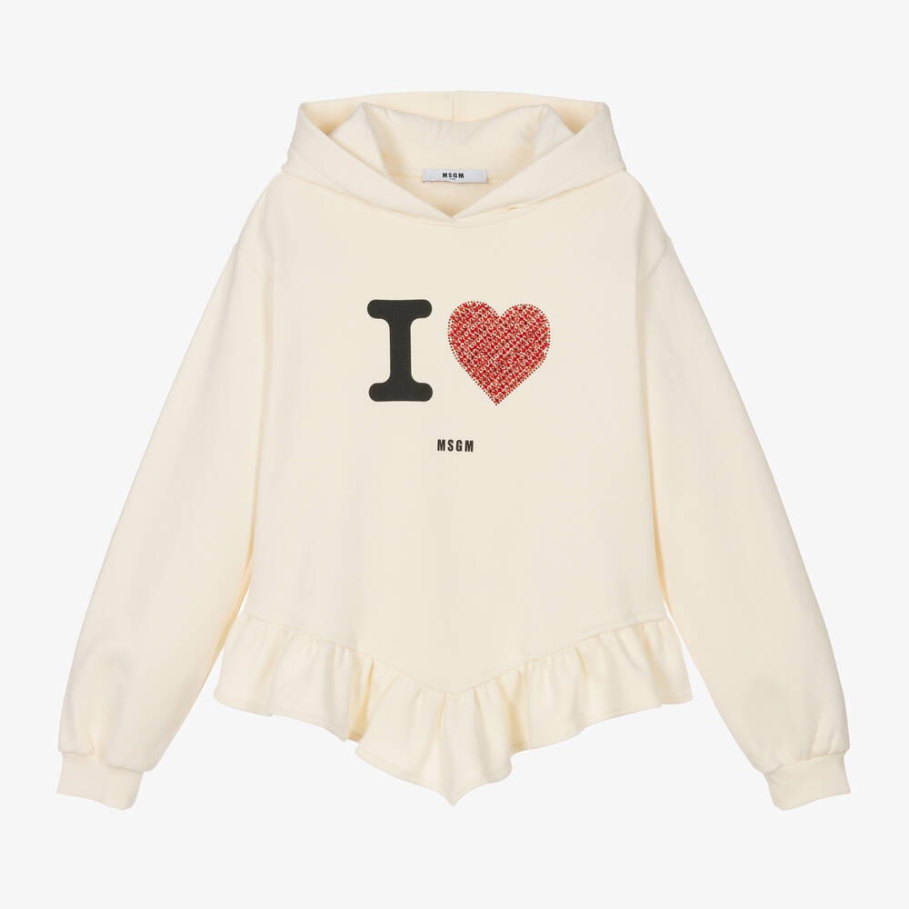 Fun ivory hoodie for girls by MSGM, made in soft, mid-weight cotton jersey with a cosy, fleecy inside. Trimmed with ruffles and designed in a relaxed fit for comfortable, casual wear, it has an 'I LOVE MSGM' motif on the front with fabulous red rhinestones.