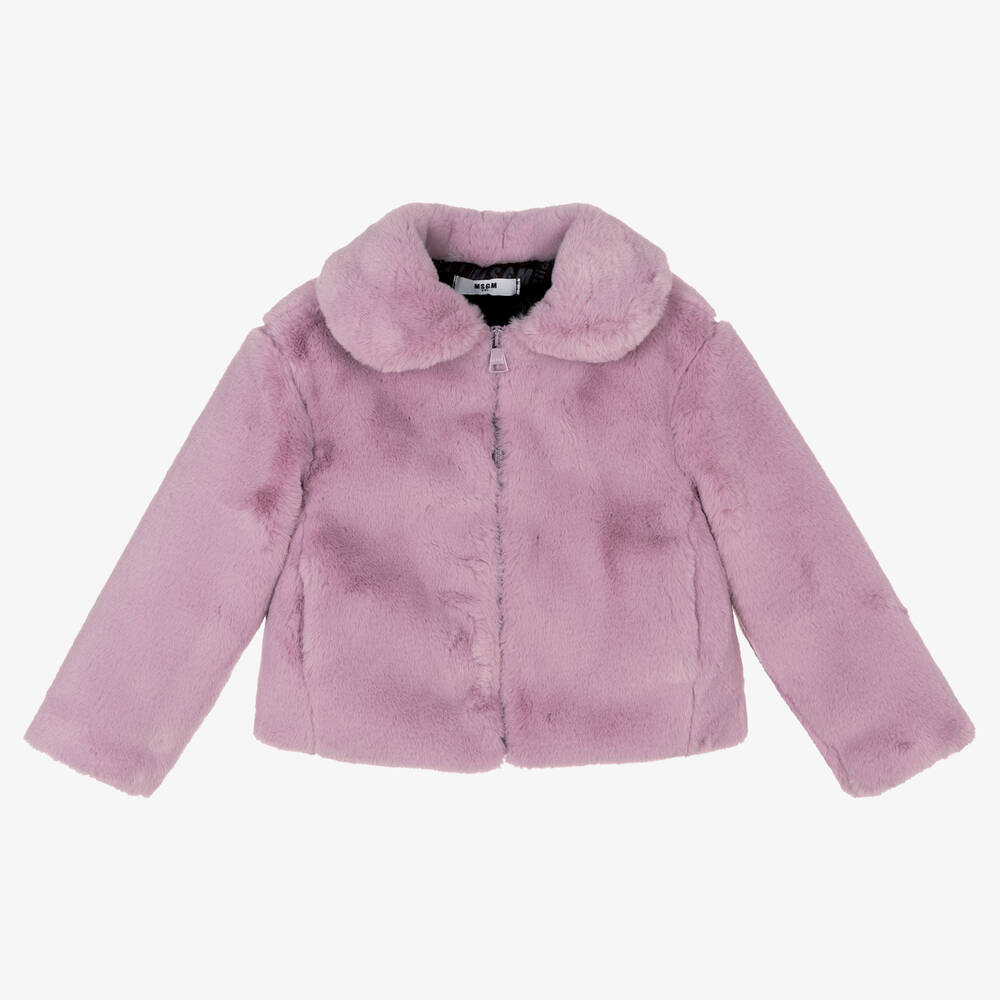 Lilac purple jacket for girls by Italian brand MSGM, in a stylish boxy fit. Made in beautifully soft plush faux fur, this cosy jacket has a black satin twill logo-patterned lining and a black and white branded faux leather patch stitched on the back. There are concealed pockets and the jacket fastens with a branded zip.
