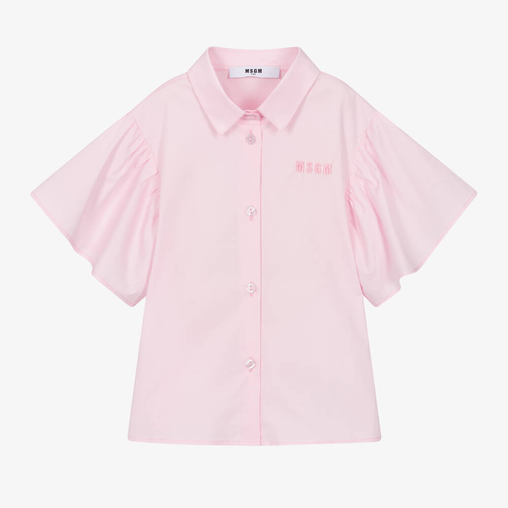 A pretty pale pink blouse for girls by MSGM, made in soft cotton poplin. Offering a fun and girly vibe, it has dramatic ruffled short sleeves and a bow tie detail at the back. The label's signature logo is subtly embroidered on the chest and branded buttons fasten down the front.