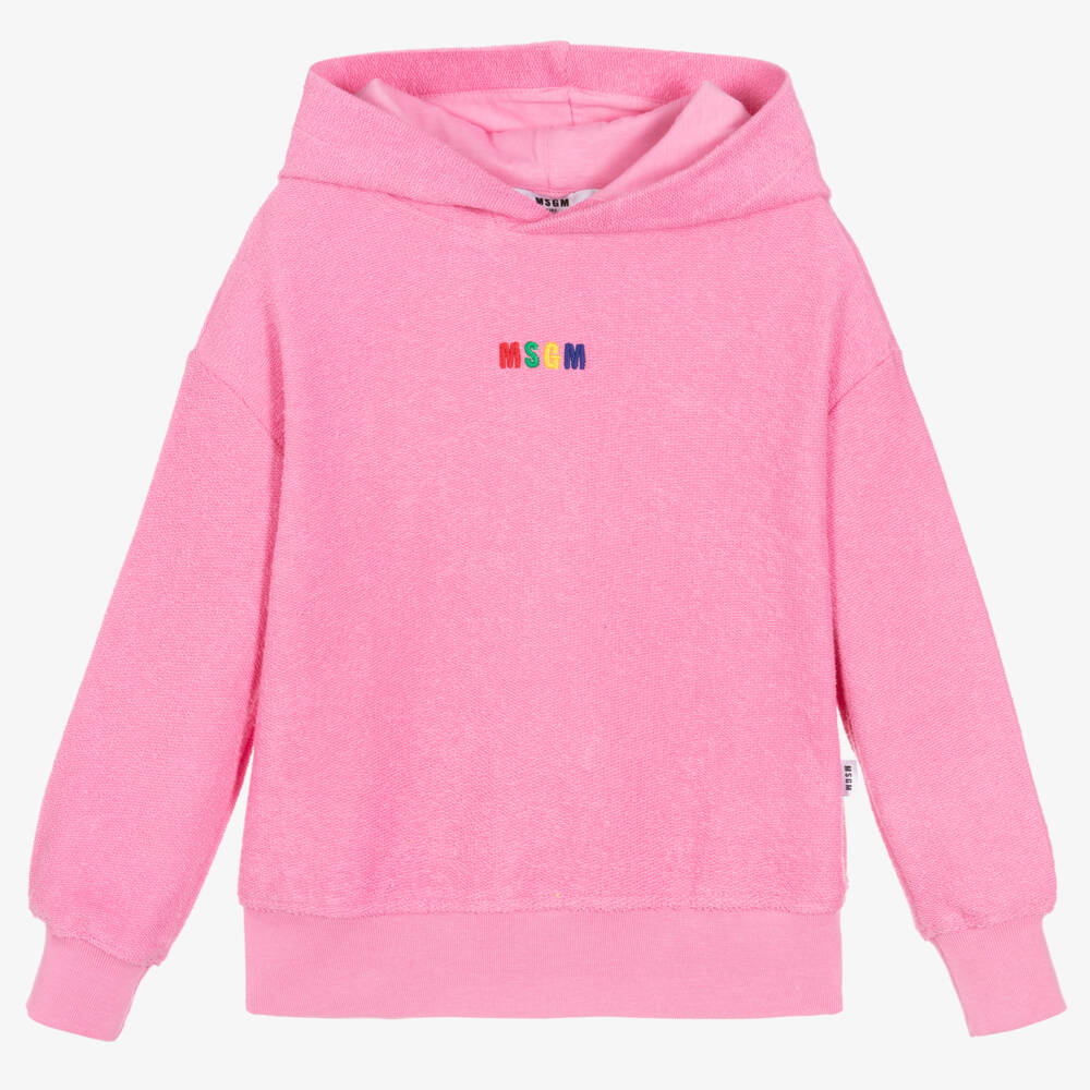 Pink cotton hoodie for girls by Italian brand MSGM, with a rainbow micro-logo embroidered on the front. Made in reversed sweatshirt jersey, it has a looped texture, with cosy ribbed trims and a logo tab on one side seam.