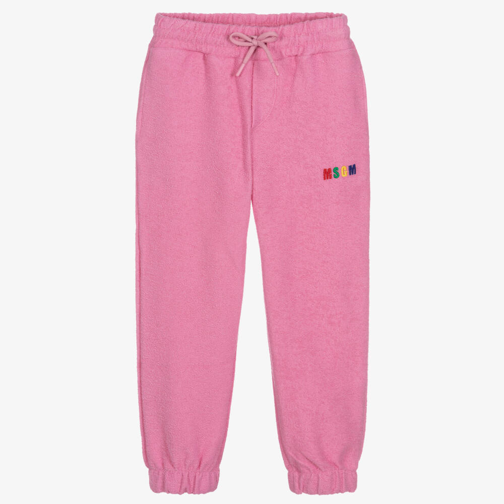 Pink towelling joggers for girls by Italian brand, MSGM. Soft and absorbent, they have a smooth underside for comfort and an adjustable drawstring waist for fit. There is a colourful embroidered logo on one leg, useful pockets at the side seams, and elasticated ankle cuffs.
