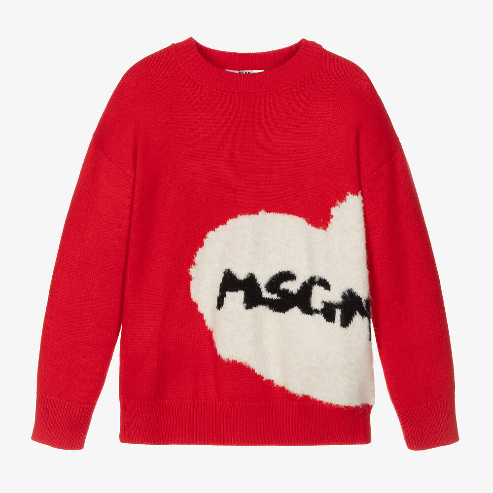 Gorgeous red sweater for girls by MSGM, knitted in a soft viscose blend. Lovely for layering up on colder days, it has an intarsia ivory and black bouclé logo heart on the front for a bold, love-inspired look. The long sleeves, crew neckline and hem are all ribbed for comfort.