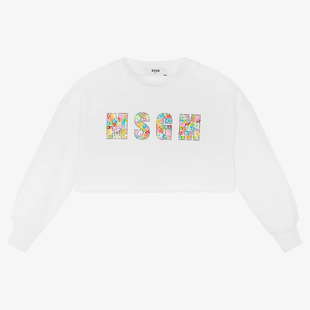 Girls white cropped sweatshirt by MSGM with a colourful logo. Made in mid-weight cotton jersey, this feminine top is decorated with floral-shaped sequins and beads for a sparkly effect and has a raw-edged hem