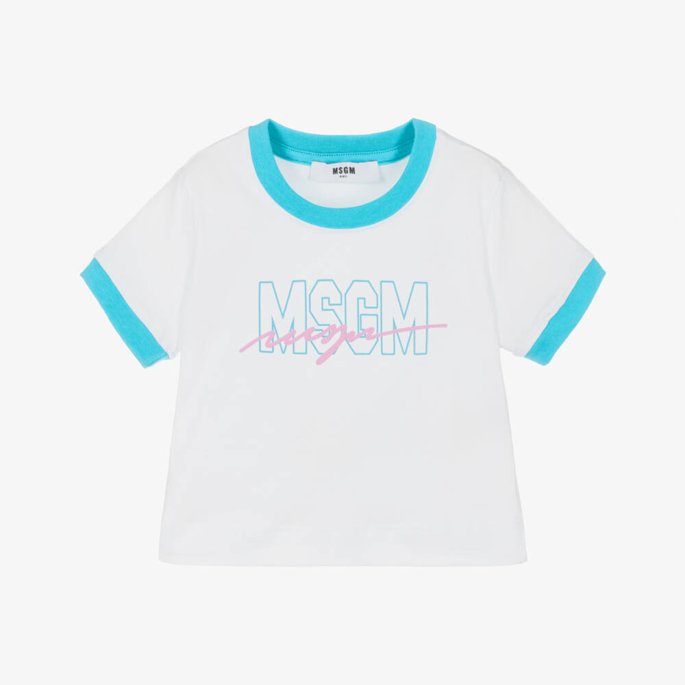 White cotton T-shirt for girls by MSGM. It has a pale blue, varsity-style logo printed on the front, with a pink cursive logo printed on top. Made in soft, comfortable jersey, it has ribbed, pale blue trims.
