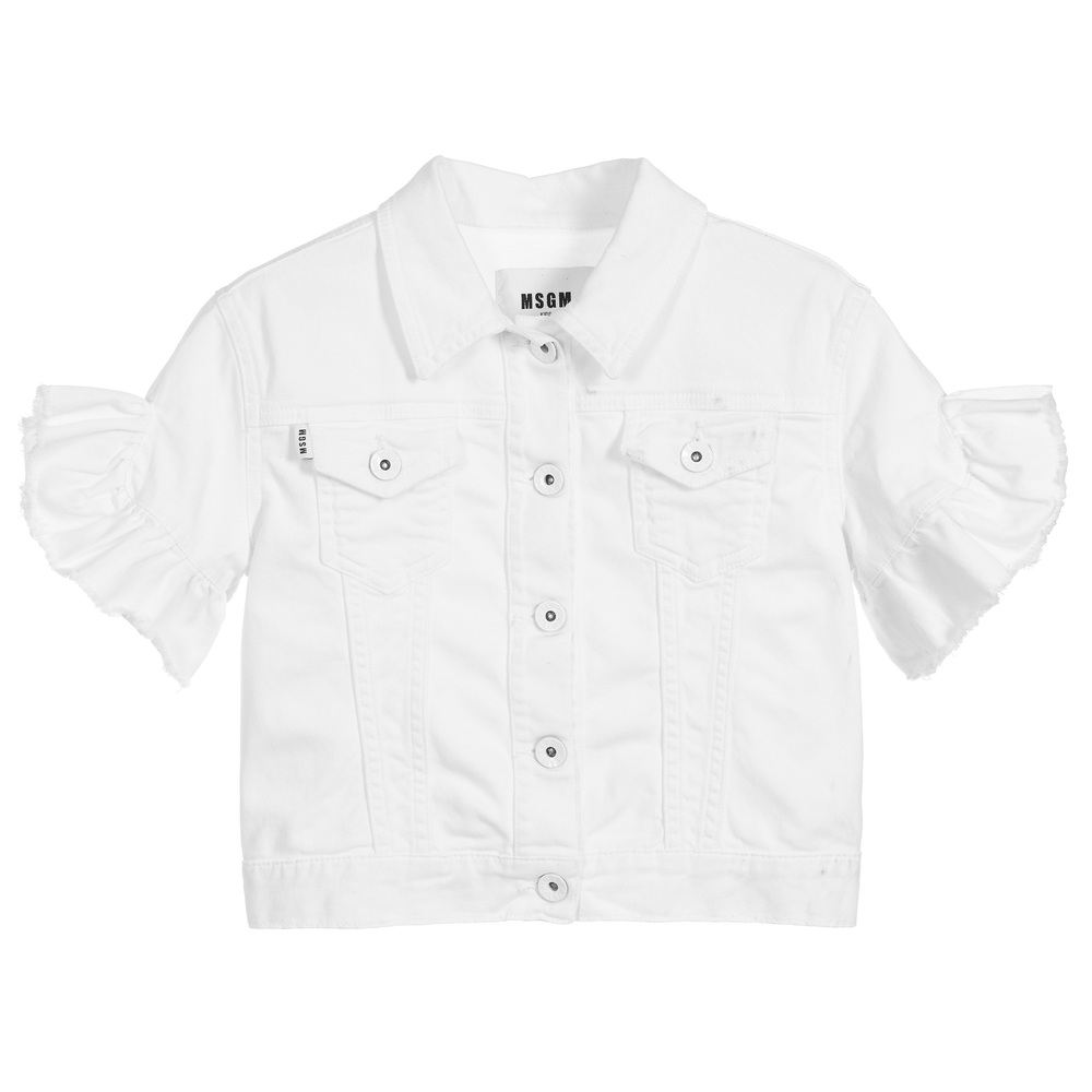MSGM white denim jacket with short, ruffled sleeves. Soft and slightly stretchy, it has two chest pockets and logo tabs on the front and back.