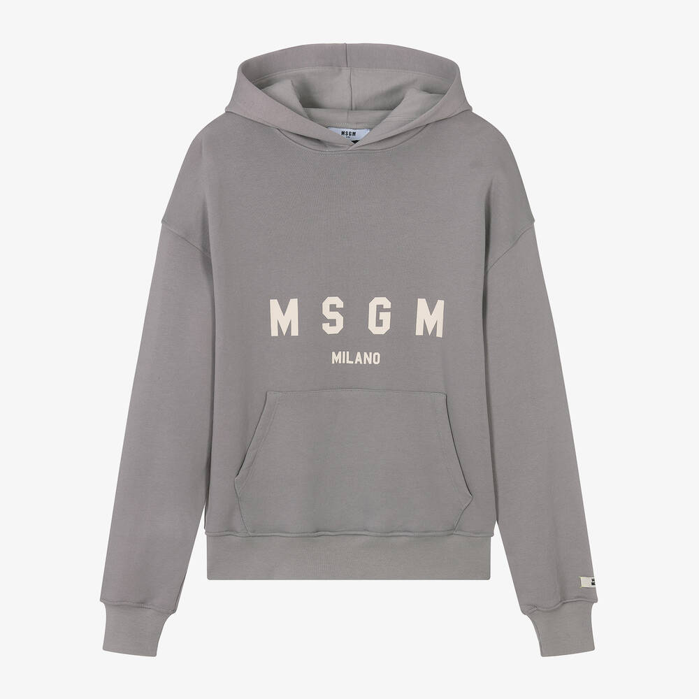 Relaxed and laid-back, this grey hoodie for boys and girls is by Italian brand MSGM. It is made from soft, comfortable, mid-weight cotton jersey, with an ivory logo printed on the chest for a signature look. Designed with dropped-shouldered, long sleeves for a casual style, there is a branded tab stitched above one of the ribbed cuffs for an extra designer finish.