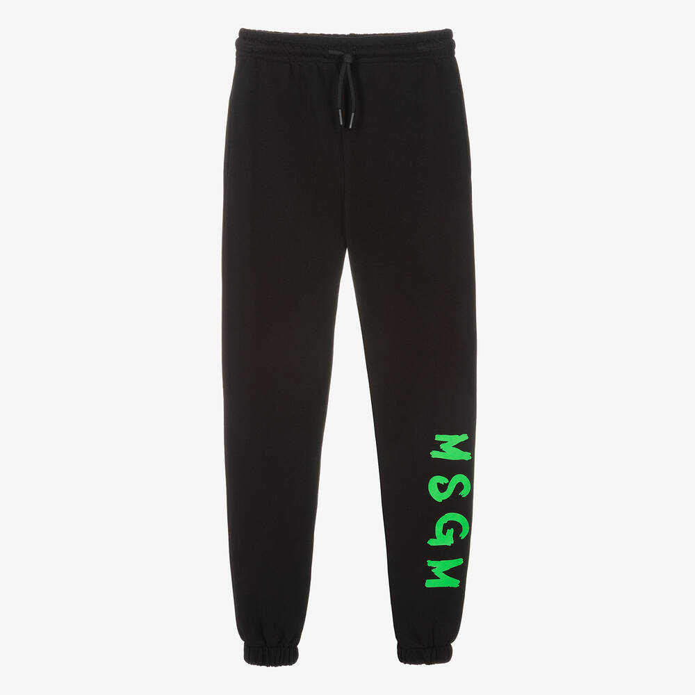 Relaxed black joggers for teen boys and girls by MSGM, combining a bold logo with casual loungewear. The bright green brushed logo is printed on one leg for a contemporary, branded look. They are made in soft cotton sweatshirt jersey for comfort, and have a drawstring waist for a great fit. There are practical side seam pockets and a patch pocket on the back.