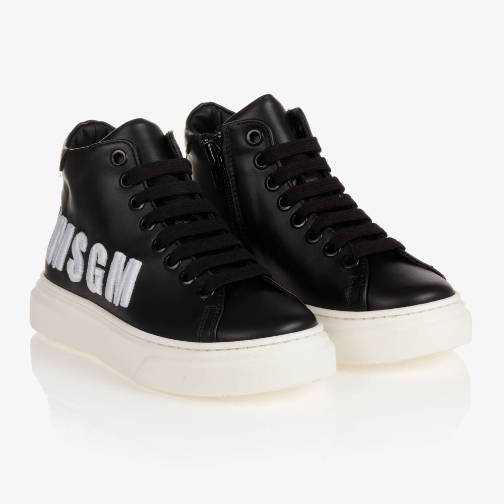 Chunky soled leather high-top trainers by MSGM for teen boys and girls. Made in soft black leather, they are lace-up and have a side zip fastening for quick and easy dressing. There is an embroidered white logo at the side, and they are fully lined in leather for all-day comfort.