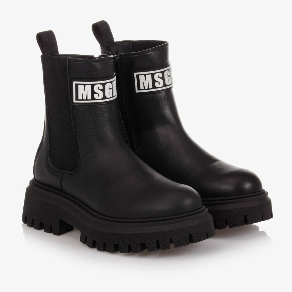 Chunky black Chelsea boots for teen girls from MSGM. Easy to pull on, they have an elasticated stretchy side panel and side zip. They are made in soft leather, with a thick rubber lug sole and deep, non-slip treads, with a silicone logo patch on the front.