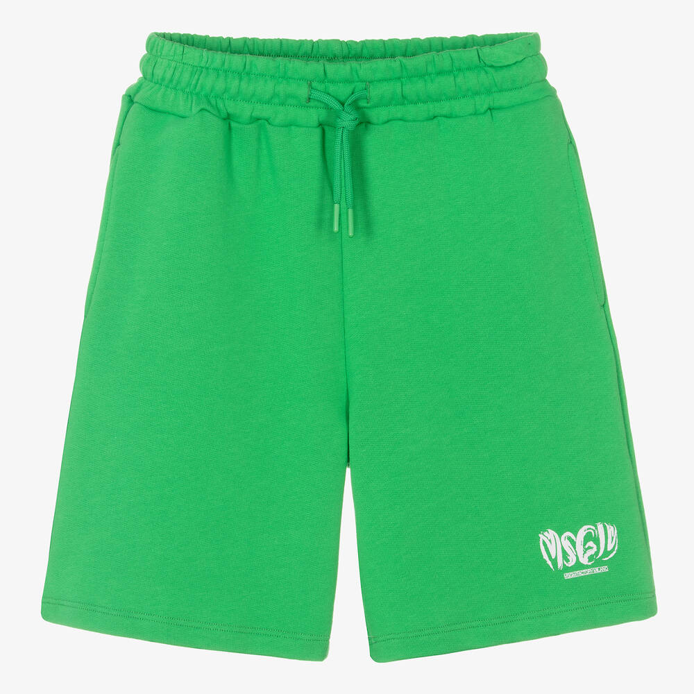 Casual green shorts for teen boys by MSGM, with a cool logo print on one leg in white. Great for laidback days spent relaxing, they have a drawstring waist for a good fit and are made in comfortable cotton sweatshirt jersey. On the side seams are useful, concealed pockets.