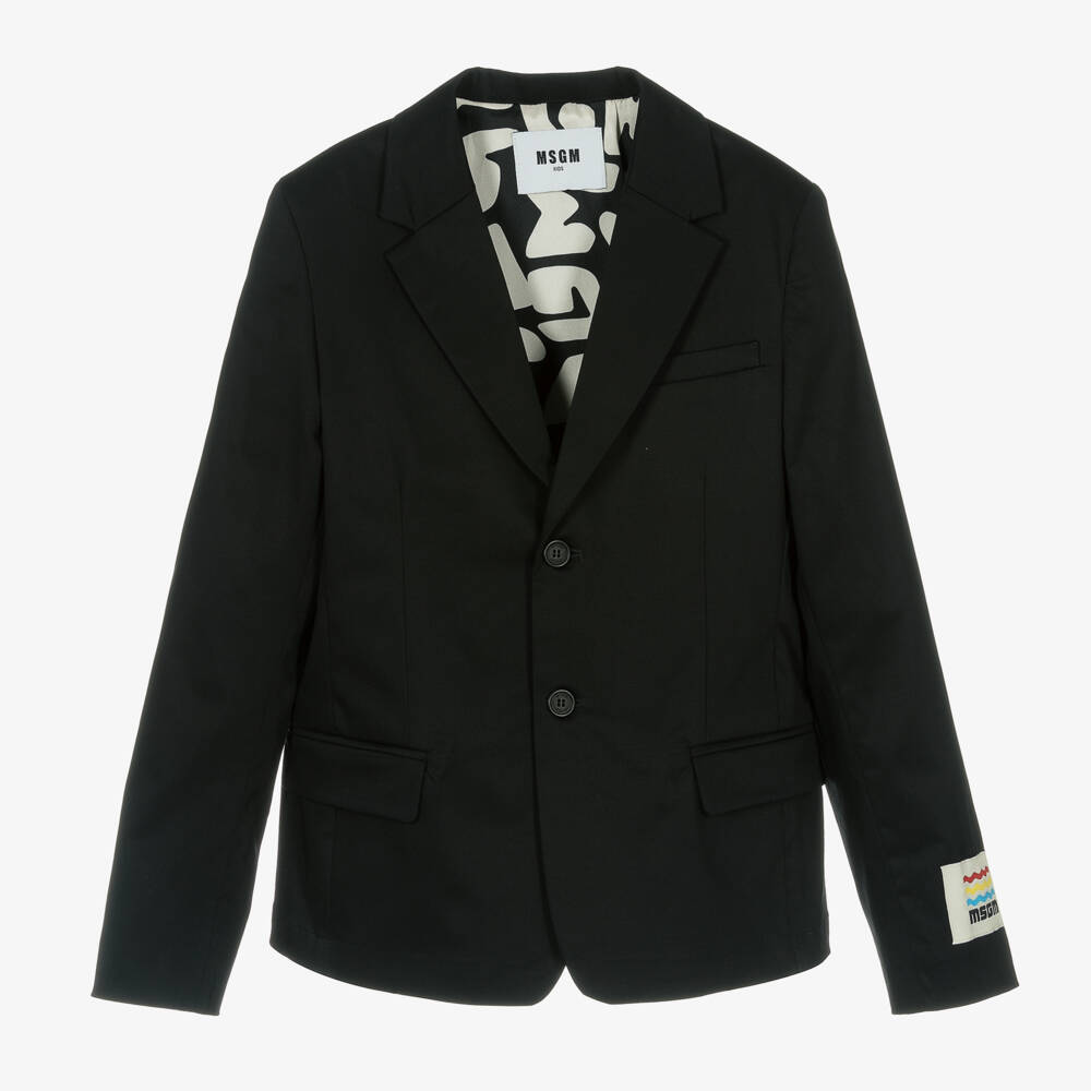 Smart black blazer for teen boys from MSGM, with abstract logo printed lining. It fastens in a traditional two button style and has an ivory logo patch on one sleeve for a quirky finish. Made in mid-weight cotton it is comfortable and has three useful pockets.