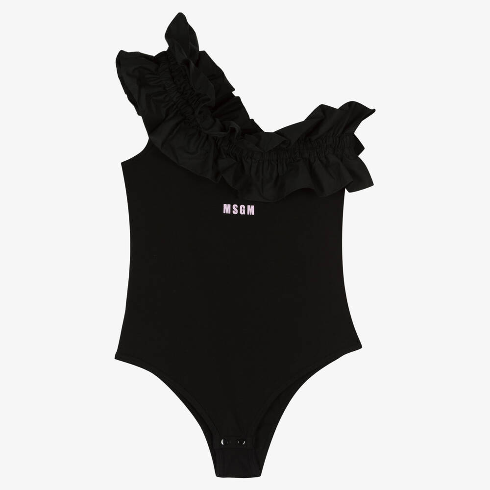 Black cotton bodysuit for teen girls by Italian brand MSGM, instantly recognisable with a pink micro logo print on the front. Made in soft, comfortable jersey, this one-shoulder design has a large taffeta ruffle around the neckline and over one shoulder for a striking look. There are popper fastenings between the legs so it always looks neat and never becomes untucked.
