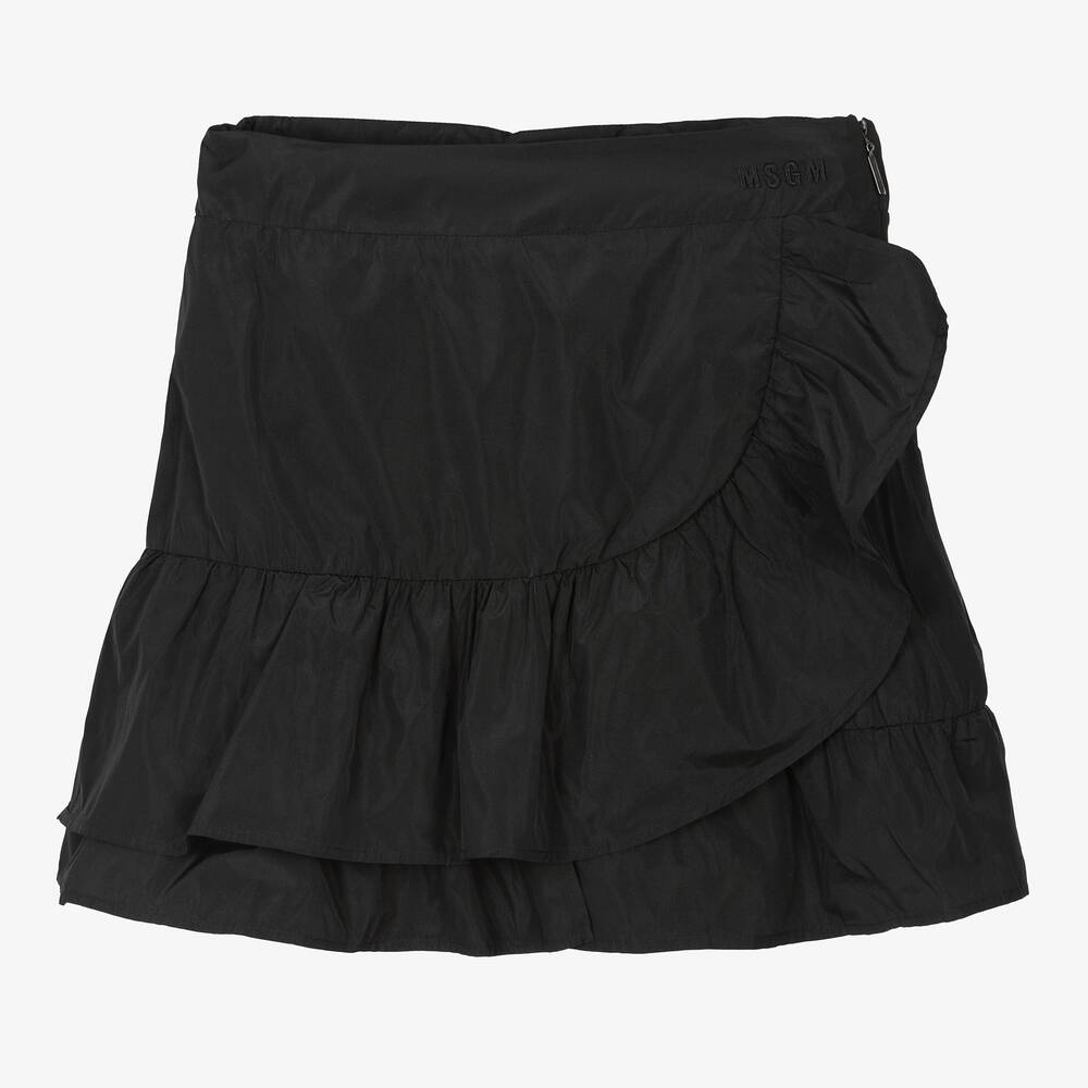An eye-catching black satin taffeta skirt for teen girls, designed by MSGM with iconic micro logo embroidery. Great for a stand-out party look, it has full voluminous ruffled trims. It fastens with a concealed branded zip on the side and has a soft voile lining.