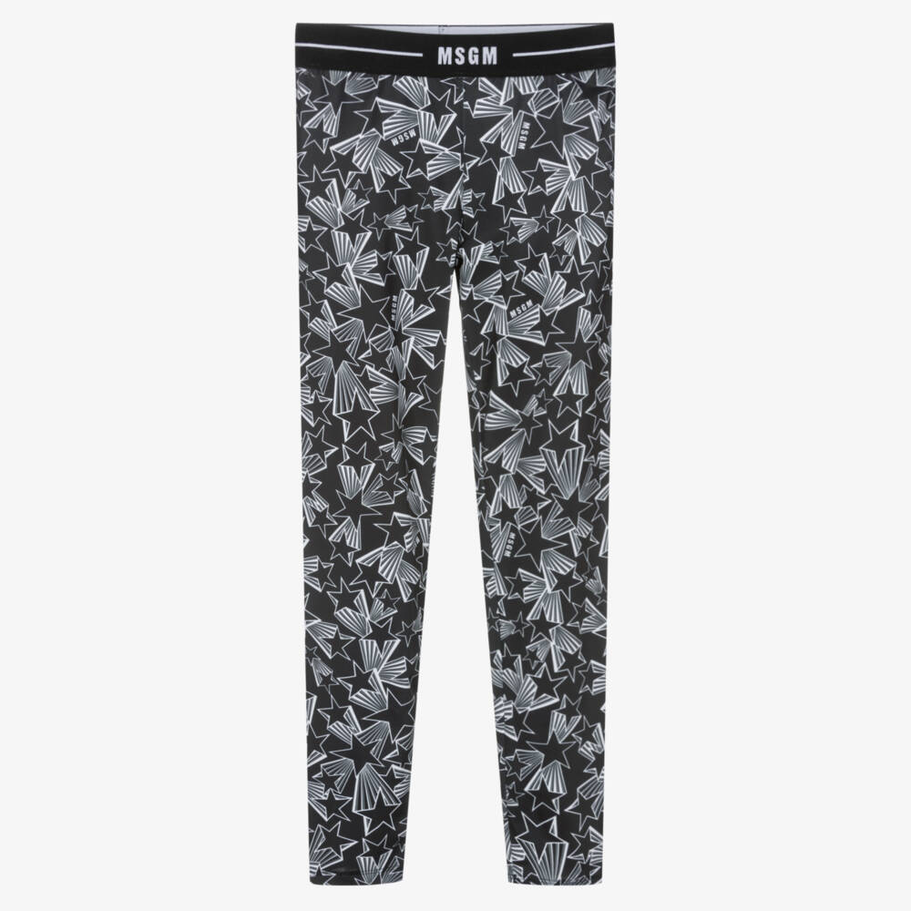 Stretchy black leggings for teen girls by Italian brand MSGM, with a white shooting star pattern. Soft and silky, they have a comfortable elasticated waistband with a sporty white stripe and a white jacquard logo in the centre. For a subtle branded finish, the recognisable micro logo can be seen within the print.