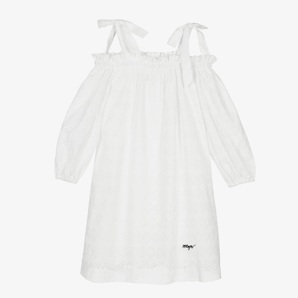 Ivory dress for teen girls by MSGM, made in cotton broderie anglaise for a soft and light feel. Designed with narrow, tie-top shoulder straps, this off-the-shoulder dress has a stretchy neckline and elasticated cuffs for added volume in the sleeves. There is a black logo script embroidered above the hem for a branded finish.