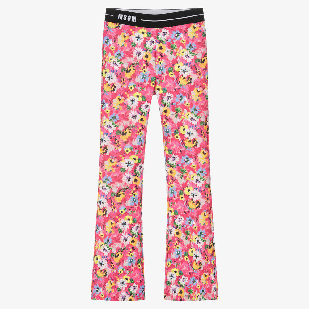 From MSGM for teen girls, a pair of pink leggings with a bright, abstract floral print and jacquard logo waistband. For a fashion-forward look, they have a flared cut and the brand's name is incorporated into the pattern for a designer finish. Silky smooth and stretchy they are cool and comfortable to wear.
