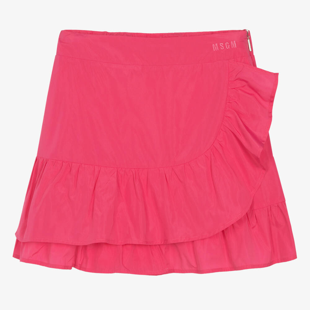 An eye-catching fuchsia pink satin taffeta skirt for teen girls, designed by MSGM with iconic micro logo embroidery. Great for a stand-out party look, it has full voluminous ruffled trims. It fastens with a concealed branded zip on the side and has a soft voile lining.