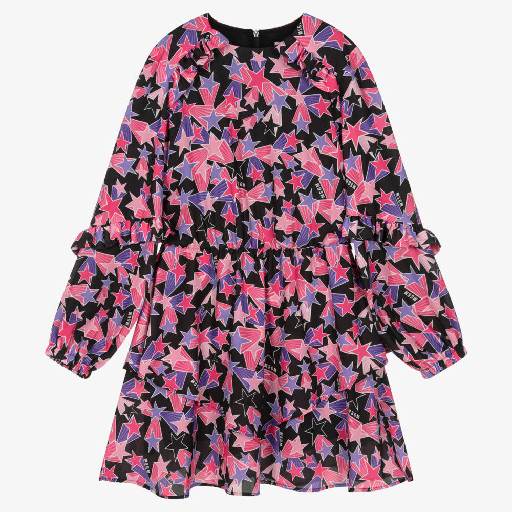 Stunning MSGM dress for teen girls in black with a pink and lilac shooting star pattern. Made in luxurious crêpe Georgette with glamorous ruffle trims, this eye-catching style has an elasticated waistband and a gathered, tiered skirt. For a discreet designer finish, the dress has a concealed back zip fastening with a branded pull, and the Italian label's micro logo can be seen within the print.